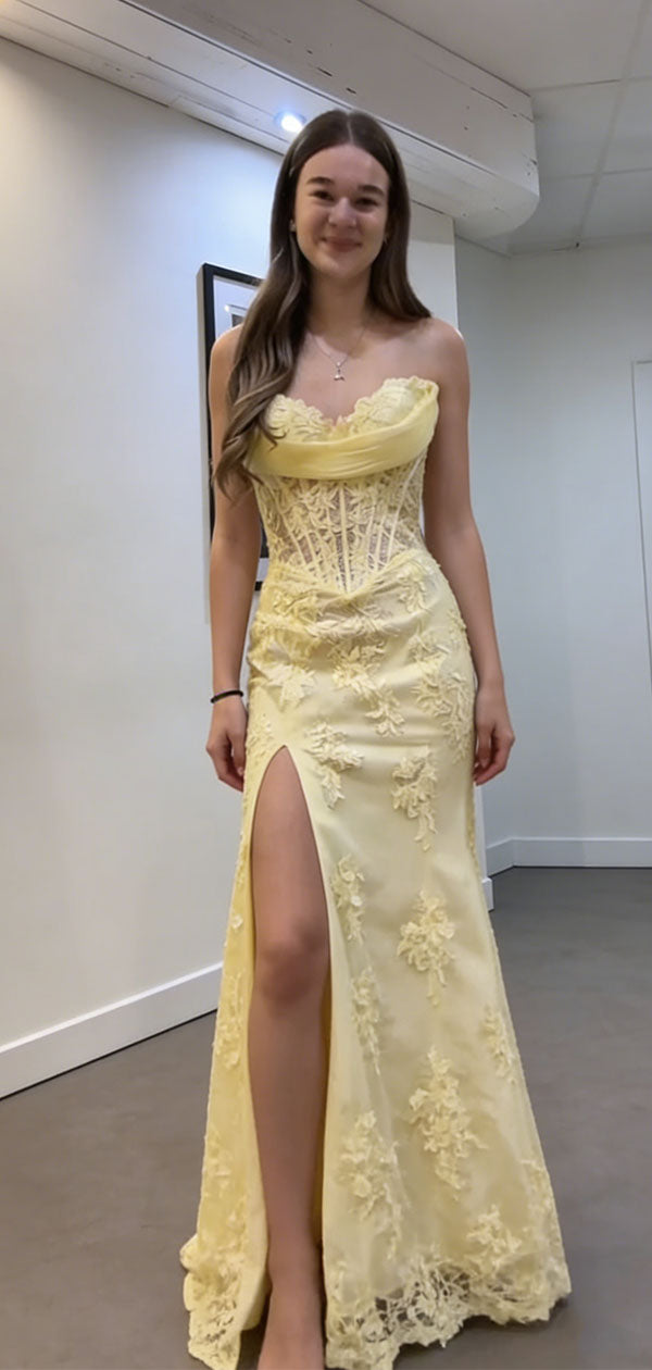 Modern Yellow Floral Lace Prom Dress Strapless Cowl Neck High Slit Corset Gala Gown,WGP2061