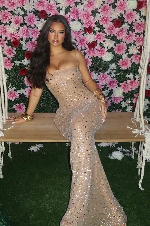 Sexy Pink Sparkly Mermaid Prom Dress Square Neck Sleeveless Sequin Eve