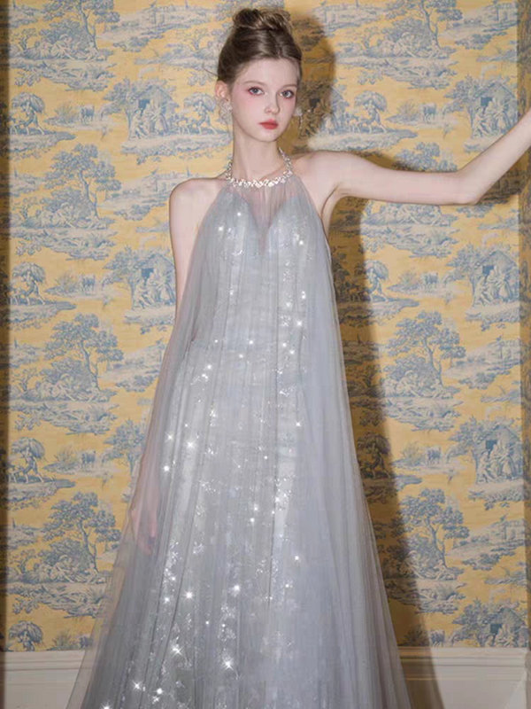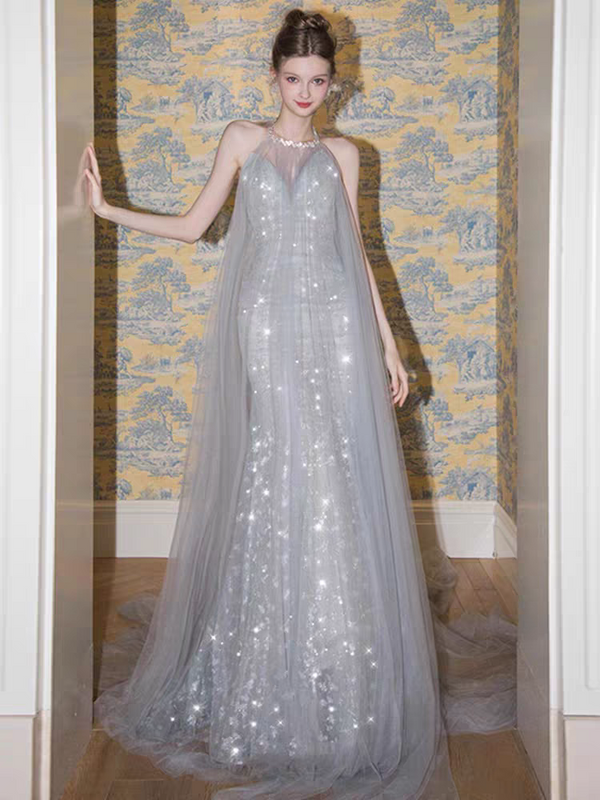 Shiny Silver Halter A-Line Long Prom Dress Ideas, Evening Party Dresses,WGP1727